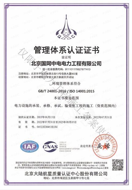 北京國網(wǎng)中電電力工程有限公司,已取得國家電監(jiān)會頒發(fā)的《承裝(修、試)電力設施許可證》、為電力施工承裝四級、承修四級、承試四級企業(yè)。北京市住房和城鄉(xiāng)建設委員會頒發(fā)的房屋建筑施工總承包二級、機電設備安裝工程專業(yè)承包二級、輸變電專業(yè)承包二級、城市及道路照明工程專業(yè)承包二級、市政公用工程總承包二級資質(zhì)、勞務不分等級,已通過ISO9001:2015 GB/T50430-2017質(zhì)量管理體系、GB/T24001-2016/ISO 14001:2015環(huán)境管理體系、